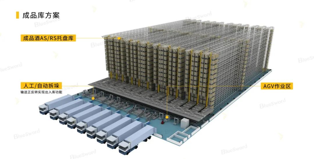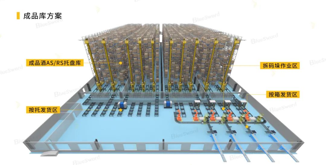 项目应用了双工位堆垛机、出入库托盘输送系统、拆垛机械手、拆打包带设备、伸缩皮带机以及WMS/WCS系统等,实现了成品酒整托入库、库间流转、整托发货、整箱发货、尾盘回库和空托流转的自动化作业。