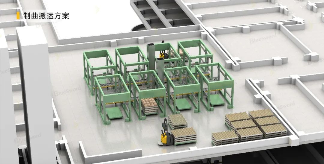 另外,在制曲搬运环节,兰剑智能的制曲搬运方案可以实现曲块的自动码垛以及AGV的自动搬运,从而降低用工数量,提高人效。