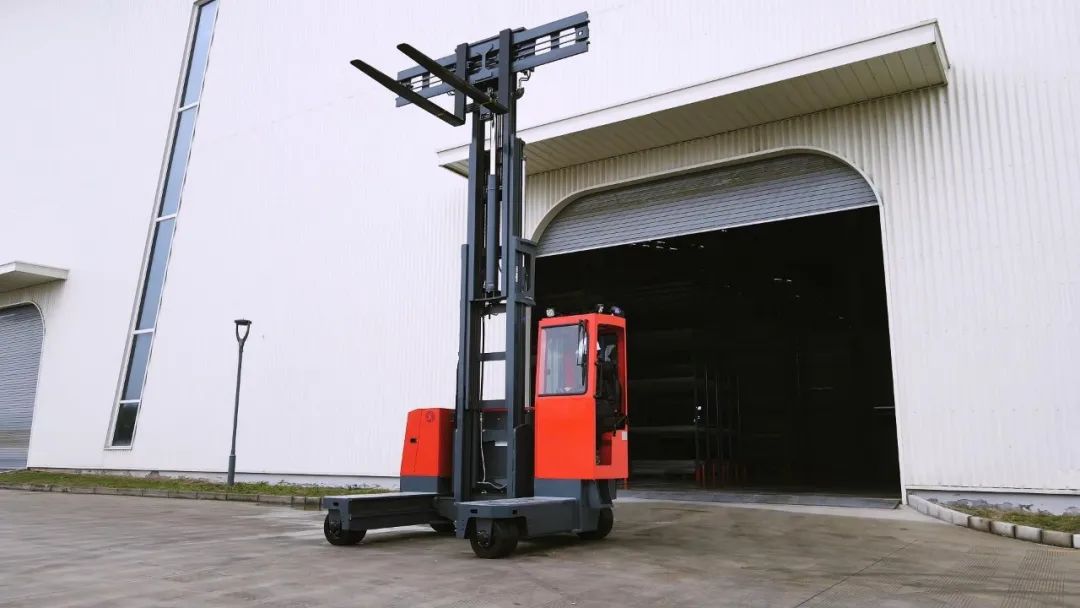 2、该款全向前移式叉车的最高起升高度到 8m,门架前移标准距离是 1.3m,使得有更大的操作空间,进行面对面货物的取放,低能耗,高输出;