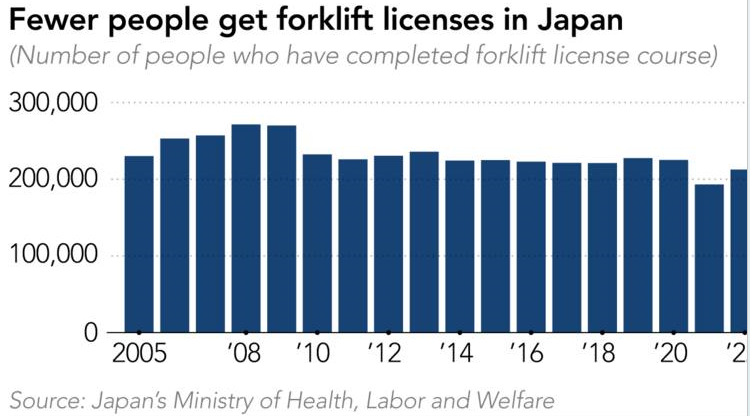 日本劳动部的数据显示,涉及叉车的事故和死亡人数一直居高不下,原因是经验丰富的操作员退休后,留下了经验不足的年轻驾驶员。