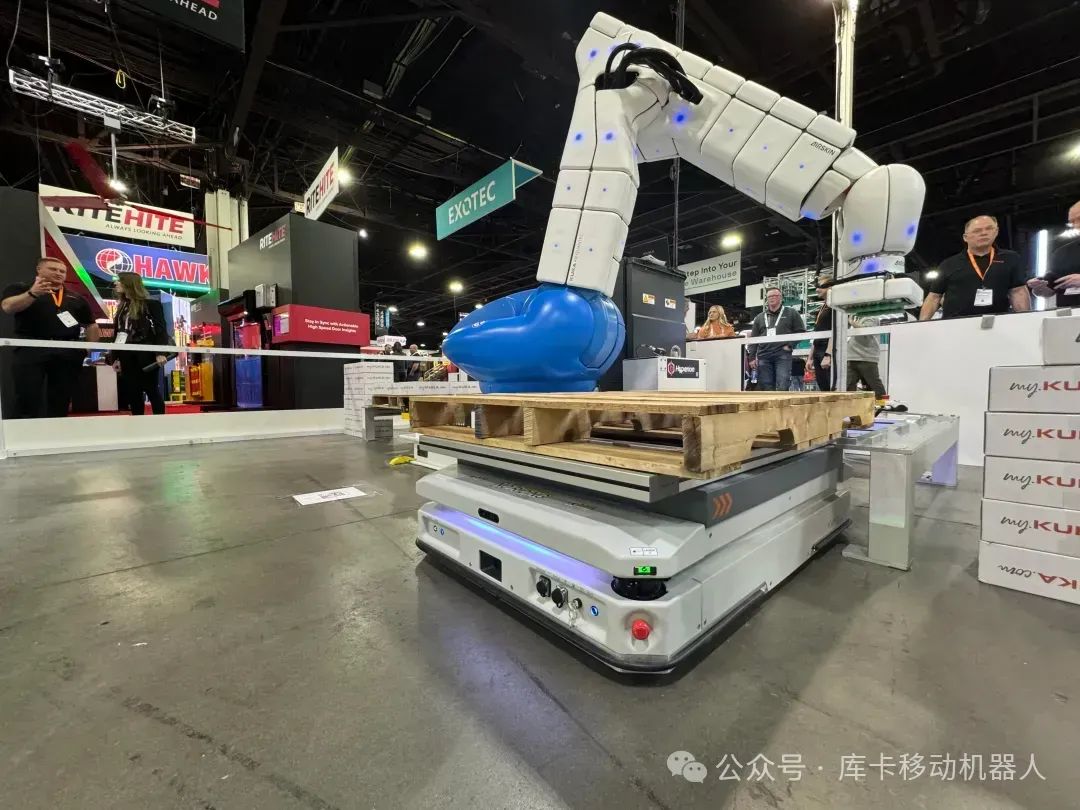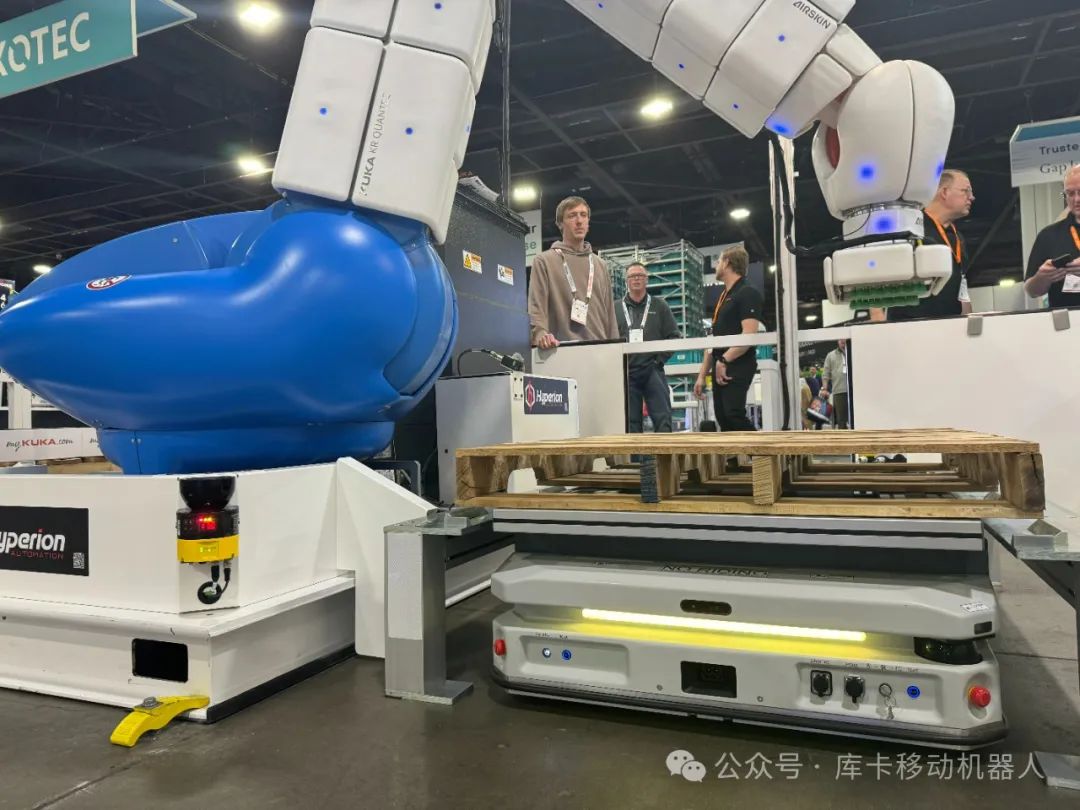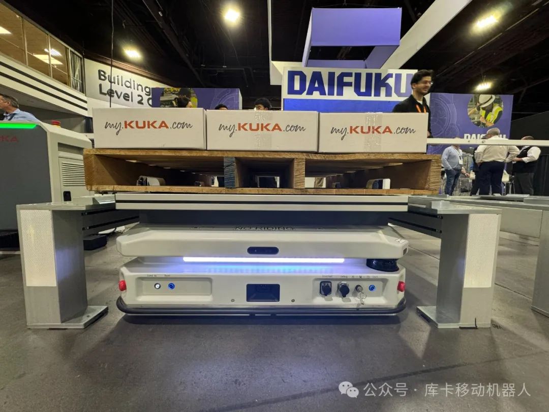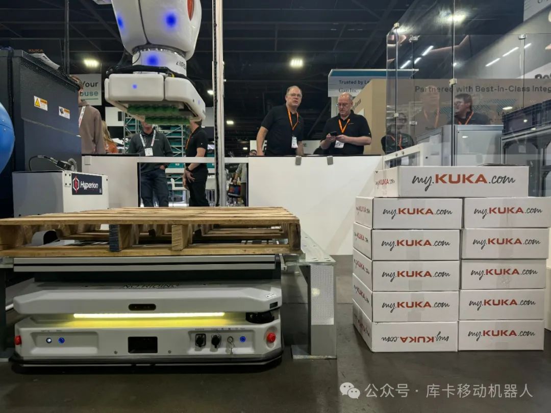 在MODEX现场,KUKA AMR展示了库卡机器人与2台KMP 1500P的高效互动对接,还原了工厂实际物流搬运场景,体现了无人化、智能化的制造工厂。