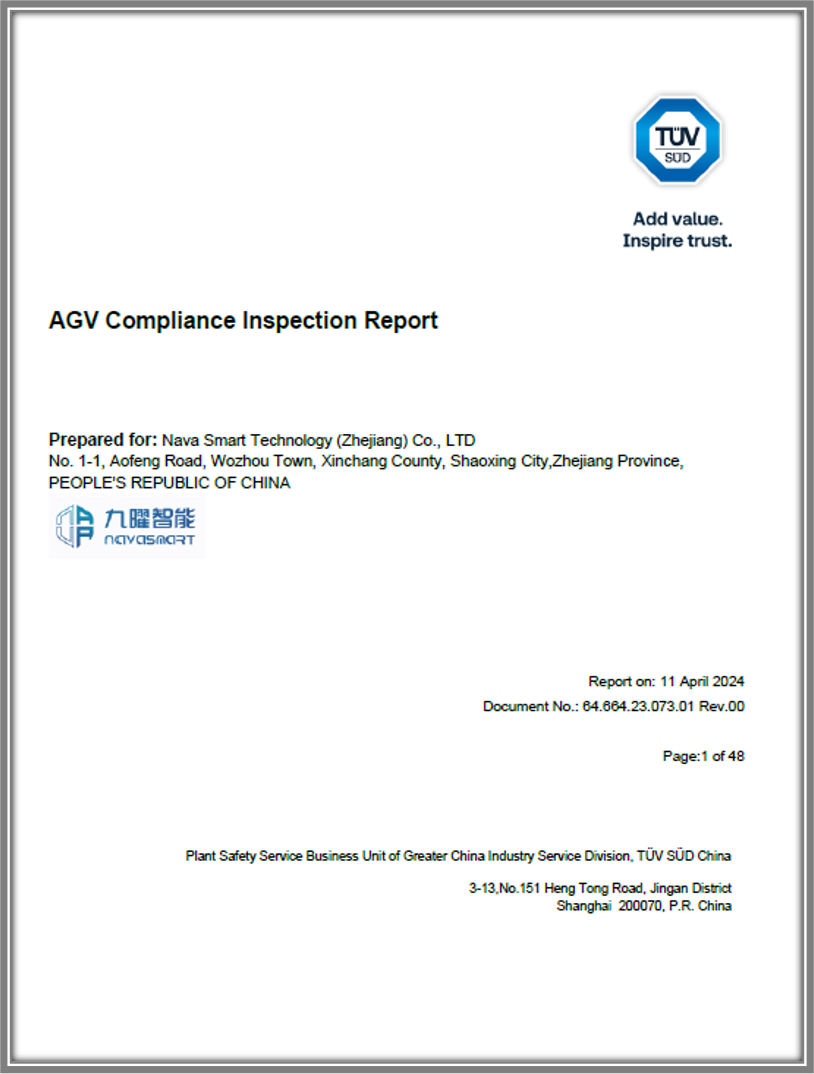 4月11日,国际知名第三方机构TÜV南德为九曜智能颁发《平衡重无人叉车PLd安全评估报告》,所有测试项目均一次性通过,安全指标达到甚至高于市场同类产品的安全要求,报告建议平衡重无人叉车投入实际业务运行。