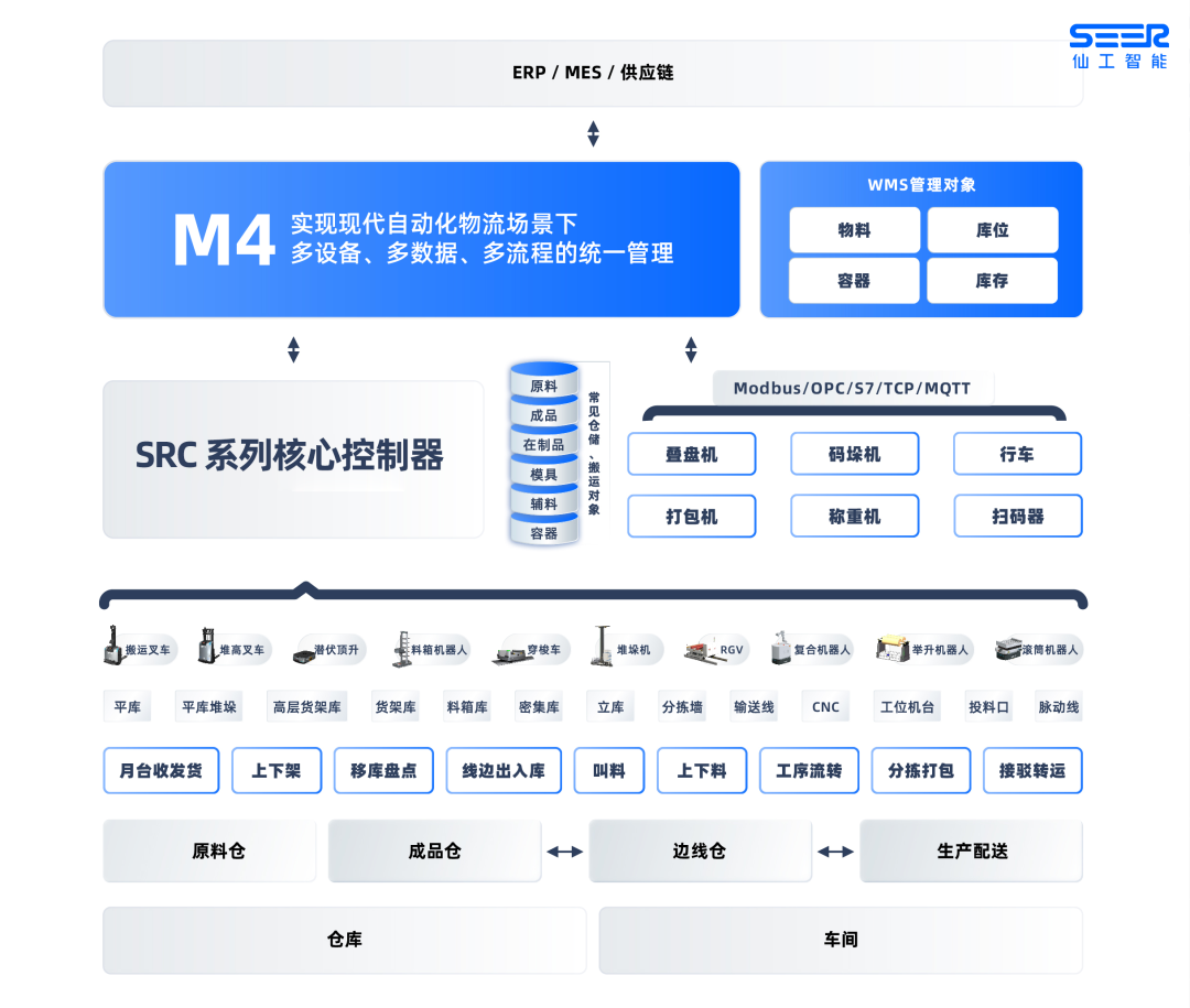 M4 集成 RCS、WCS、WMS 功能于一身,一体化管理解决机器人管理与运单管理问题、各类与机器人配合作业的自动化设备管理问题、入库出库等仓储业务问题,降低系统对接及维护成本,打破多系统间的数据孤岛。