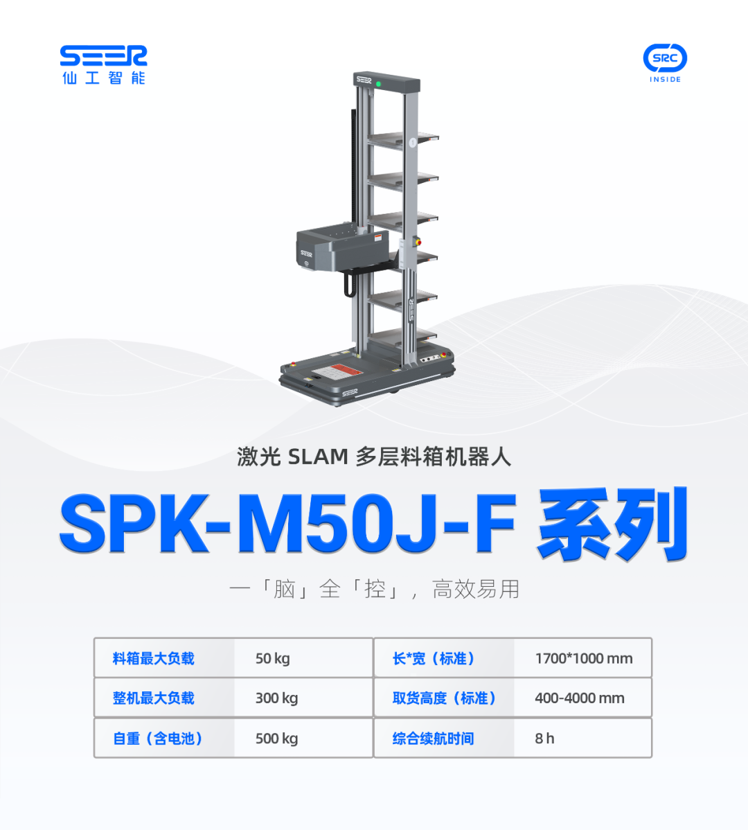 SPK-M50J-F 系列是基于仙工智能 SRC 系列核心控制器推出的激光 SLAM 多层料箱机器人,真正意义上做到了一「脑」全「控」,解决了传统料箱机器人无法实现一体化控制的痛点,保证料箱机器人行走、取放货等动作一体化,高效合理应对存储、拣选、搬运的仓储物流需求。