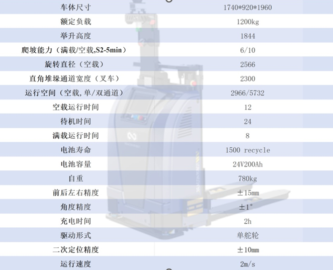 2.高承载能力:具有出色的承载能力,能够搬运重型货物,额定负载达到1200kg。