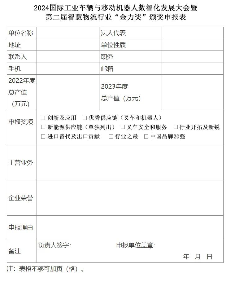 ④ 第二届行业“金力奖”精评臻选,将以申报企业2023年度为考评范畴,贴近实际,更注重申报企业的高质量发展、数智化转型成果,新技术新能源的研发和应用,扬帆出海的出口能力等,业绩斐然,标新立异。设立:创新及应用、优秀供应链(叉车和机器人)、新能源供应链(单独列出)、叉车安全和服务、行业开拓及新锐、进口替代及出口贡献、行业之最、中国品牌20强。(附申报表)