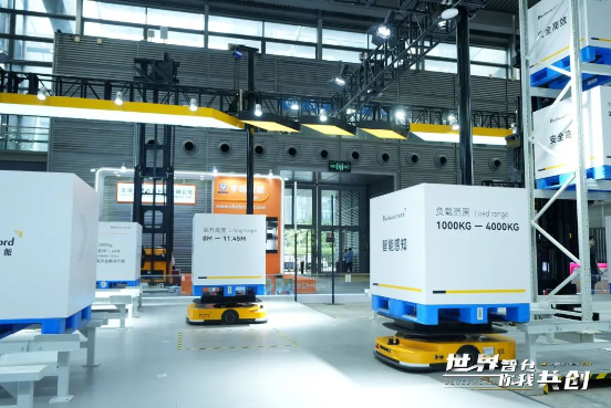 专注呈现内部物流前沿科技,构建物流全产业链解决方案。兰剑智能在本次展会上展示了潜伏搬运机器人、电动堆高叉车和前移式叉车三款AGV联动协同,闭环作业的场景。