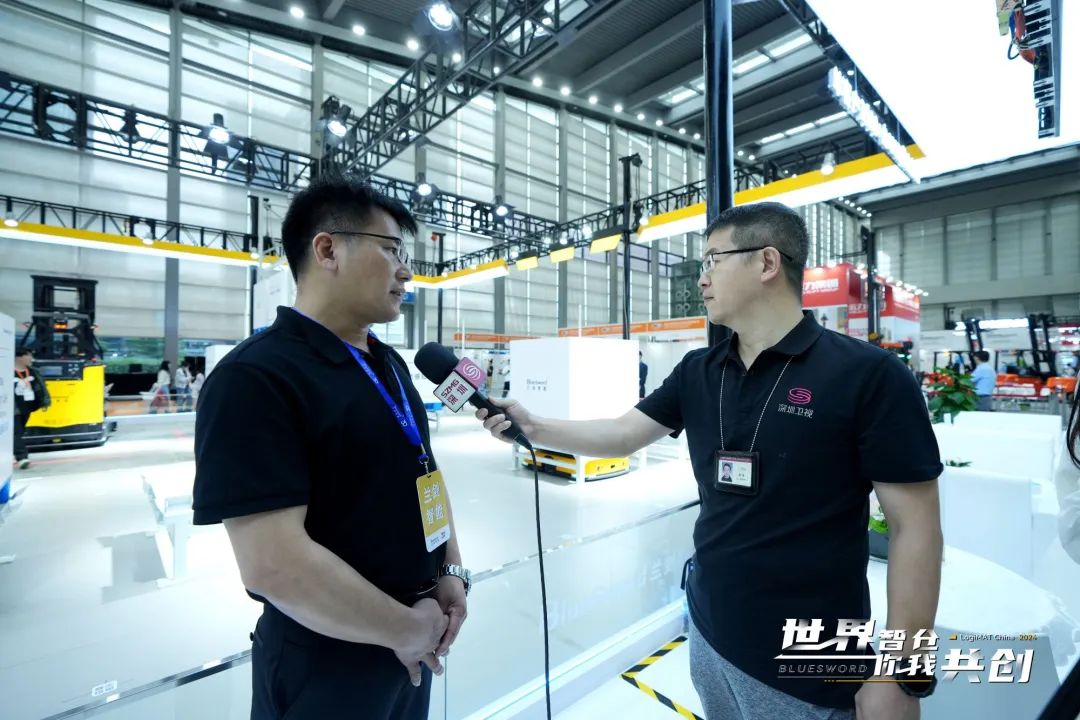 兰剑智能在为广大国际宾客呈现多系列产品协同作业,贯穿出/入库及拣选配送环节的托盘级AGV全流程解决方案的同时,也为宾客讲解兰剑智能其他的前沿技术产品和解决方案,展位上人来人往,更是吸引了电视台前来采访报道。