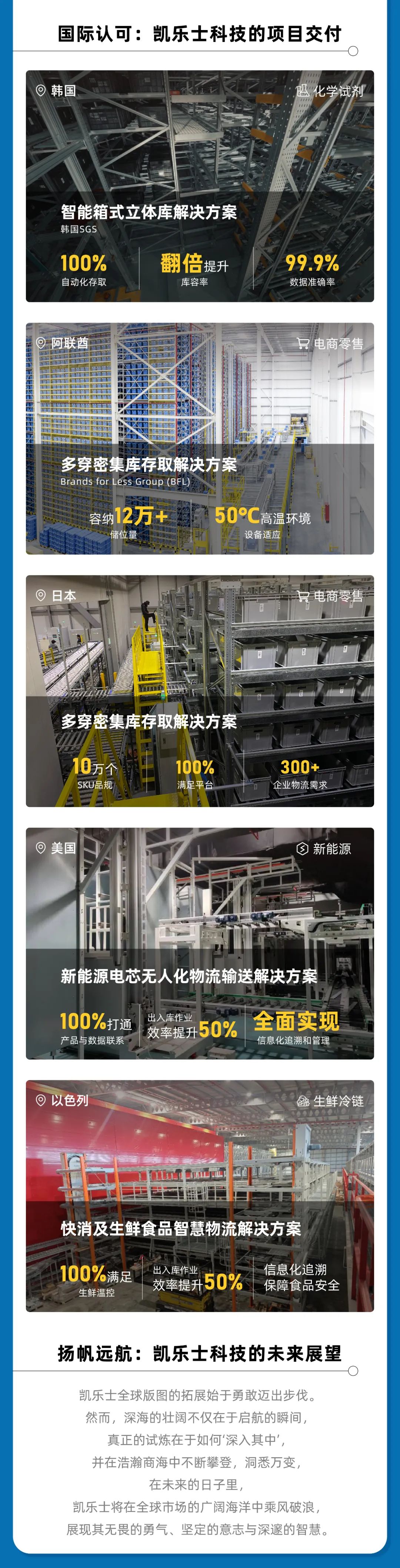 作为智能物流机器人专家,凯乐士科技提供业内领先的模块化、可扩展的综合智能物流解决方案,赋能企业供应链运营模式的转型,令运营效率再创新高。