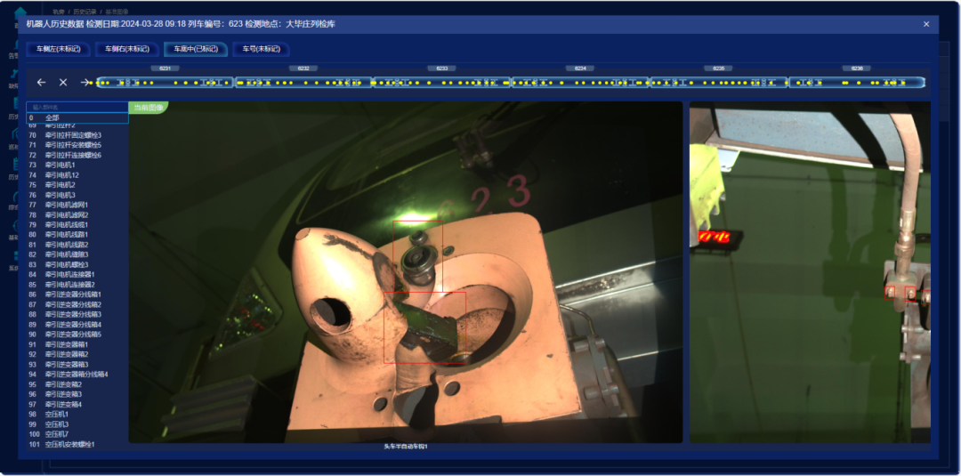 津铁车辆公司充分利用现有的设备资源,将智能巡检机器人与轨旁智能检测设备协同联动配合使用,充分发挥两者检修功能互补的优势,实现检修效能最大化。经数月的试验累积,智能巡检机器人已分析梳理出车下近千个检测点位,可实现中心销安装螺栓、牵引电机线缆等外观检查,以及中心销下端盖间隙、横向止挡间隙尺寸的测量等。