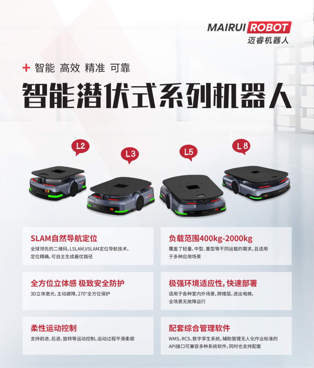 迈睿机器人拥有完整的潜伏系列产品,包括潜伏顶升AMR(L2、L3)、重载AMR(L5、L8)及定制AMR(辊筒式AMR)等,产品品类齐全,可满足厂端车间物流转型升级需求,提供全流程、全环节及不同行业的智能制造完整解决方案。