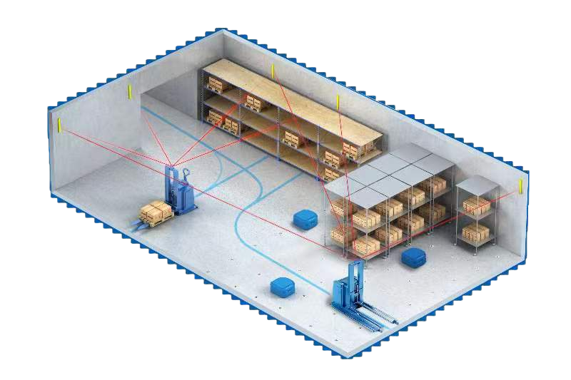 通过激光扫描出工作区域中布置的反光板,来推断AGV/AMR自身位置实现导航。这种导航方式要求布置好的反光板位置不能变动。在行驶的路径上,要求AGV/AMR最少能扫描到两个安装夹角大于30°的反光板。