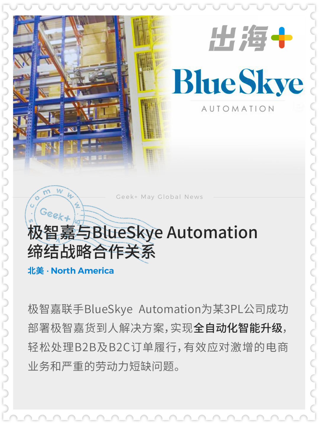 ⭐再添新伙伴!极智嘉与BlueSkye Automation达成战略合作,BlueSkye Automation总裁Armando Gonzalez表示:“通过与极智嘉合作,我们助力汽车、制造、医药、电商等客户充分利用AMR,实现工作效率和生产效率的双重提升。”