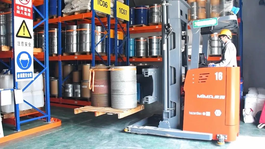 这款MiMA站驾式三向叉车采用了窄门架设计及防爆高清摄像头,作业视野更优越,安全性更高;此外,专利门架缓冲系统显著降低了作业过程中的晃动量,确保化学原料在仓储作业时的安全与稳定性。