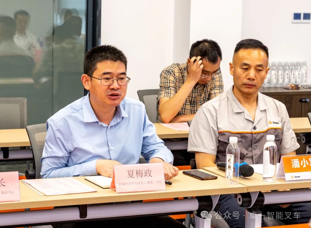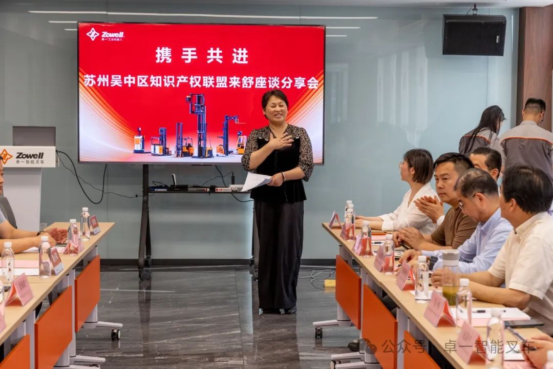 座谈交流会在卓一厂区会议室举行,卓一智能叉车副总经理吴爱君致欢迎词。