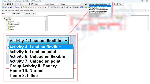 行驶路径由图形绘制,并以线段呈现。一条线段代表一部分行驶路径,而且系统设计人员可以设定某一线段上的车辆表现(行驶速度、行驶方向等)。系统设计者可设定在哪里以及如何进行装载、卸载和电池充电等操作。这些位置称为站点(Station)。也可以设定基于车辆位置的其他操作,例如开门和关门等。在Layout Designer工具中创建的布局需要被装载到其他系统软件中才能生效。