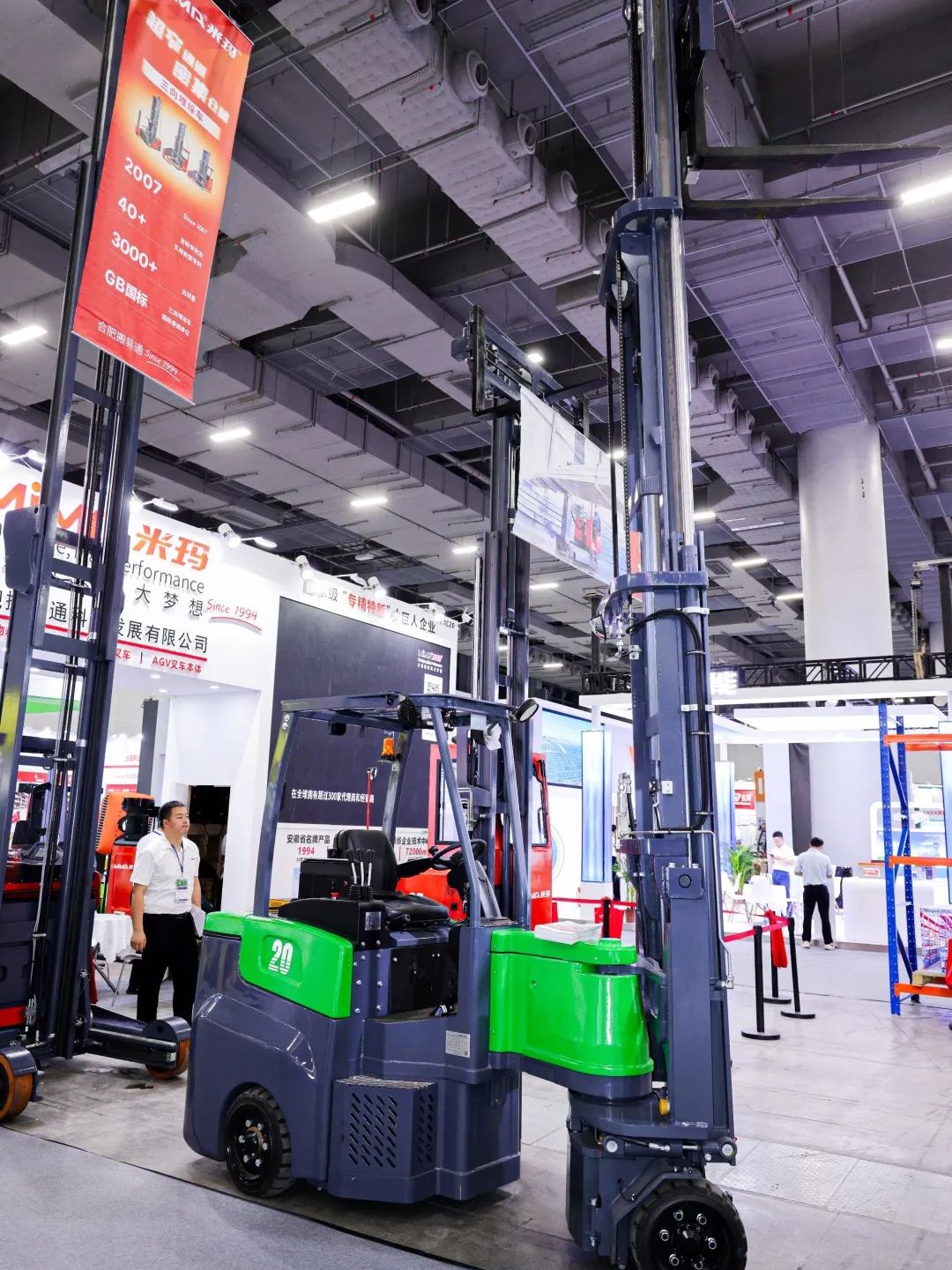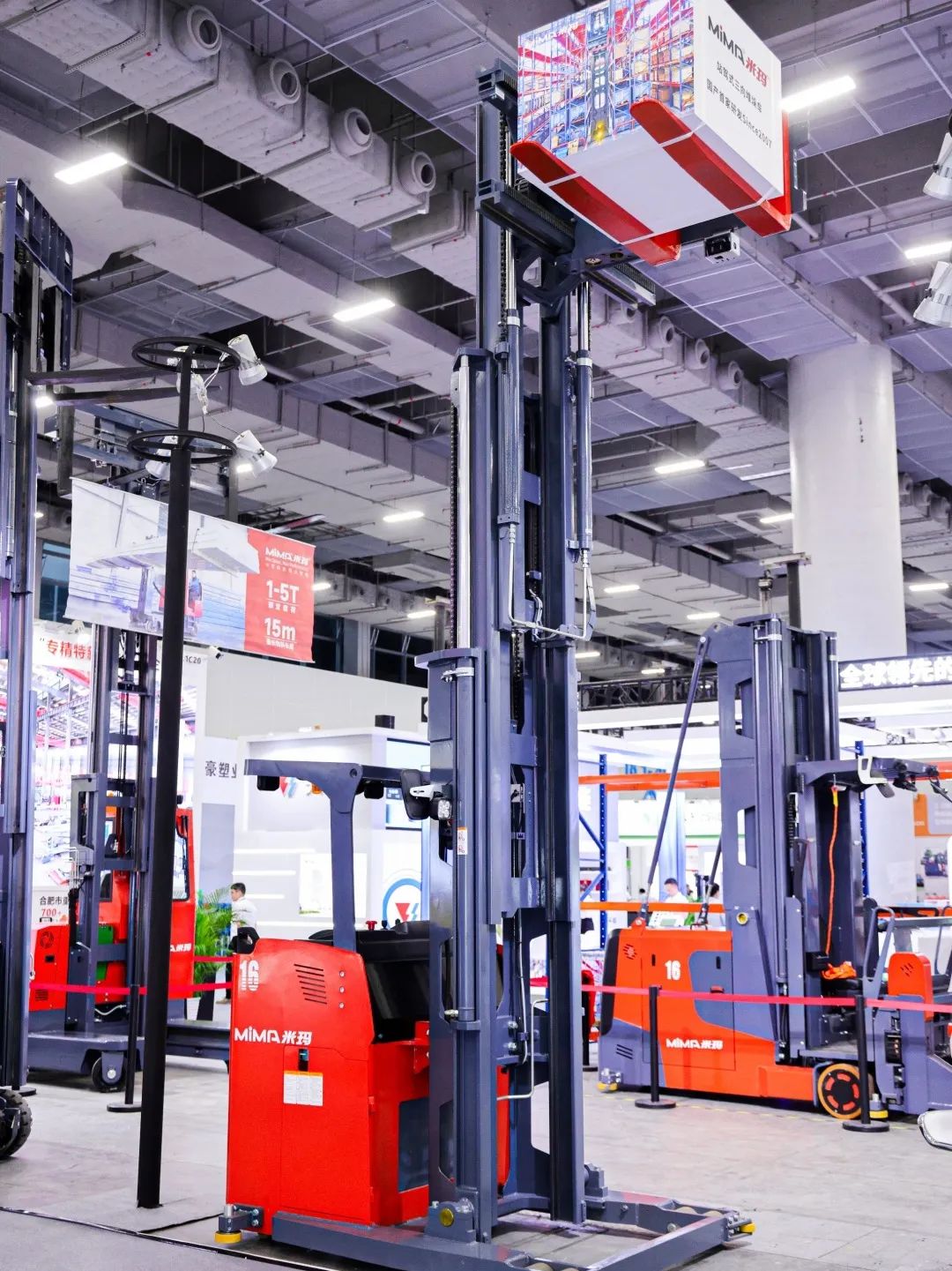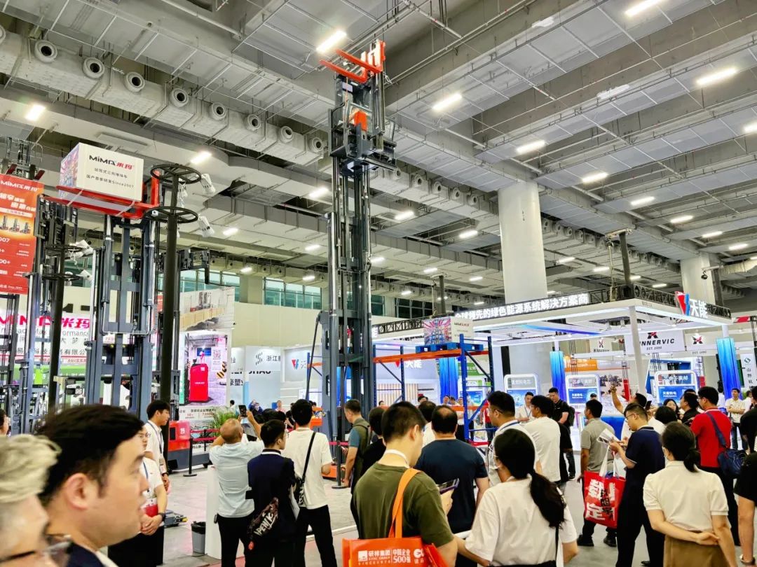 展位现场特别设置了动态演示区域,成为展会的亮点之一。在这里,专业人员操作并演示了MiMA的几款明星产品:1.6吨人上型三向叉车MCC16、2.5吨全向叉车MQC25以及2.0吨铰接式叉车MJ20。观众们纷纷驻足观看,近距离地感受MiMA电动叉车的灵活性以及其他卓越性能。