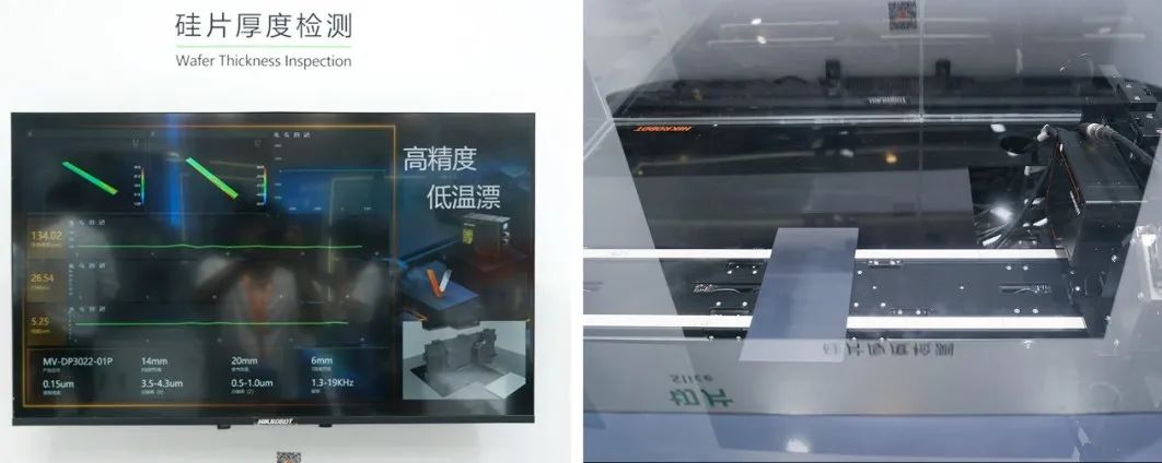 该环节还展示了硅片厚度/侧边检测方案。其中,六台3D激光轮廓传感器测试硅片厚度,六台相机两两对射,同时测量三组数据结果。硅片平均厚度数据重复性精度≤0.5μm,TTV(单线厚度波动)重复性精度≤1.5μm,线痕(单线轮廓高度)重复性精度≤2μm。