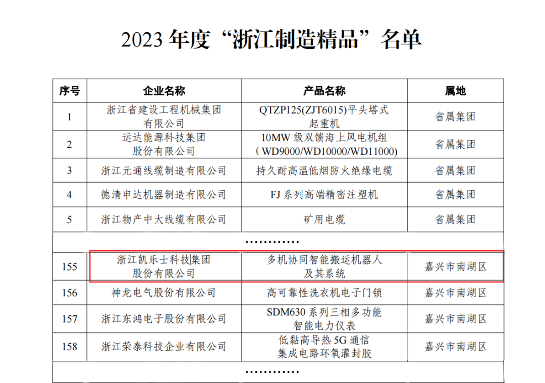 近日,浙江省经信厅公布了2023年度“浙江制造精品”名单,由浙江凯乐士科技集团股份有限公司研发的“多机协同智能搬运机器人及其系统”产品成功入选“浙江制造精品”。