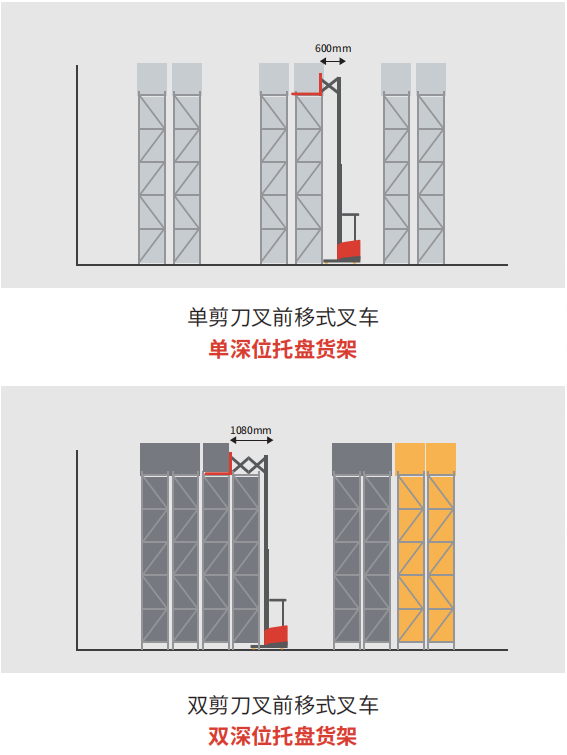 MiMA米玛双剪刀叉前移式叉车MFE14,额定载重1.4吨,货叉前移距离为1080mm,最大起升高度同样是10160mm。适用于双深位托盘货架,不仅提高了货物堆放稳定性,还显著提升了仓储库容率。