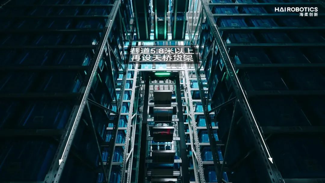 在海柔ACR与AMR同场协作的模式下,ACR负责目标料箱的取放与库区内理货,AMR负责料箱的出入库搬运。因此,货架通道5.8米以上可部署天桥货架,进一步提升仓库空间的利用率和存储能力。