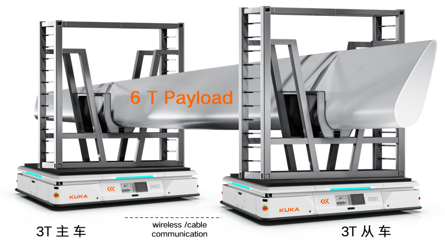 KMP 3000i具备双车协同能力,可实现两台KMP 3000i的双车协同,通过负载固定或软链接,实现重物、大型异形货物的搬运,最大负载提升至6000kg,完成柔性化大件运输。