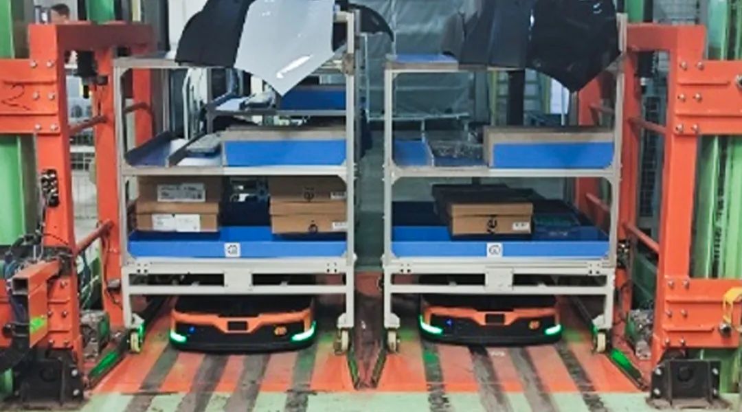 采用潜伏AMR搬运齐套器具,AMR环线运行,依次停靠各工位,完成备料,考虑任务均衡,一次对接电梯,实现两个器具一起随电梯转运,电梯运载效率大大提高,满足现场使用要求。