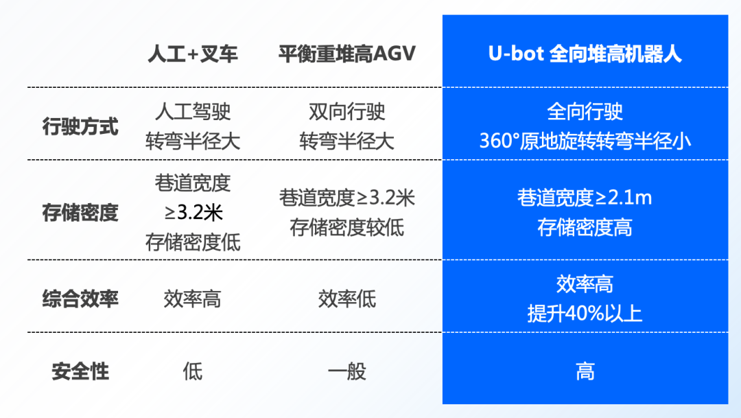 A:如下图所示,U-bot全向堆高机器人和传统人工叉车以及市面上常见的平衡重堆高AGV对比,在行驶方式、存储密度、综合效率、安全性几个方面都有显著的革新和优势。