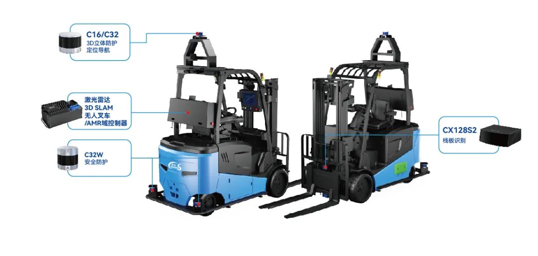 镭神智能3D SLAM无人叉车集成多个高性能3D激光雷达,实现全方位高精度环境探测感知与安全防护,其中配置了一颗128线混合固态激光雷达进行各式料笼识别,通过特征提取与位姿计算对比,再配合高精度3D SLAM技术,无人叉车能够准确自主地走到目标位置,完成料笼精准堆放。
