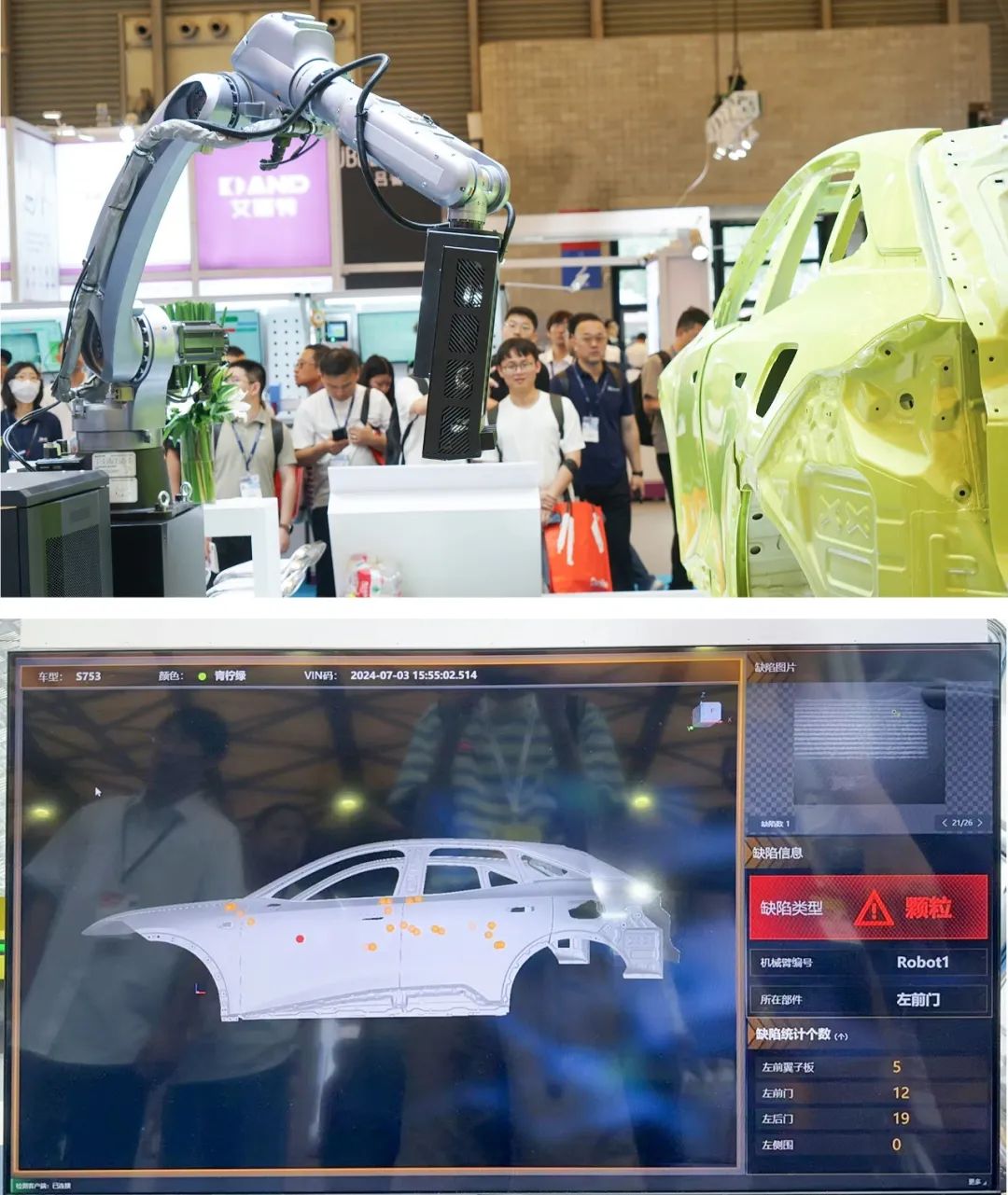 采用海康机器人自研的程控条纹光传感器进行采图,对车漆表面的颗粒,漆疤、划痕、气泡、针眼等缺陷进行在线全检,最小可实现0.2mm的缺陷检测,借助机械臂的柔性,检测可达性区域几乎覆盖100%车身。