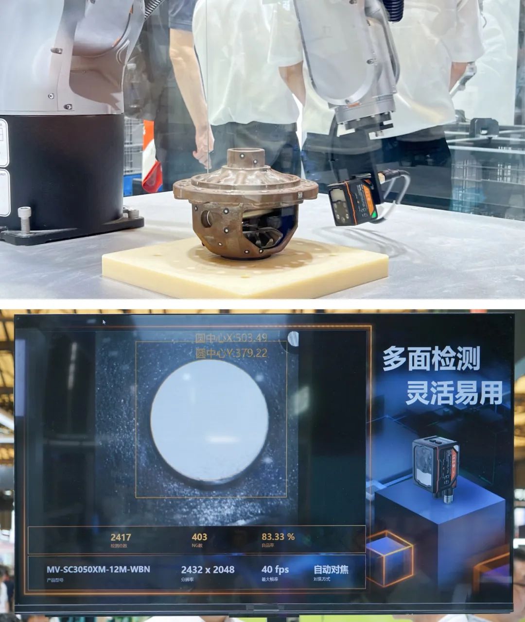 集成像、算法、存储、通信于一身的SC3000X系列视觉传感器,体积小巧,外观紧凑,安装更加灵活,内部嵌入了读码、有无、正反、测量、识别和计数等防错检测算法,搭配机械臂对铸造件的各个面进行码信息、字符信息的检测。
