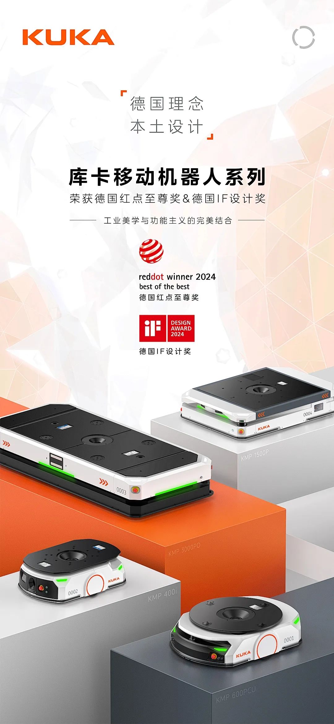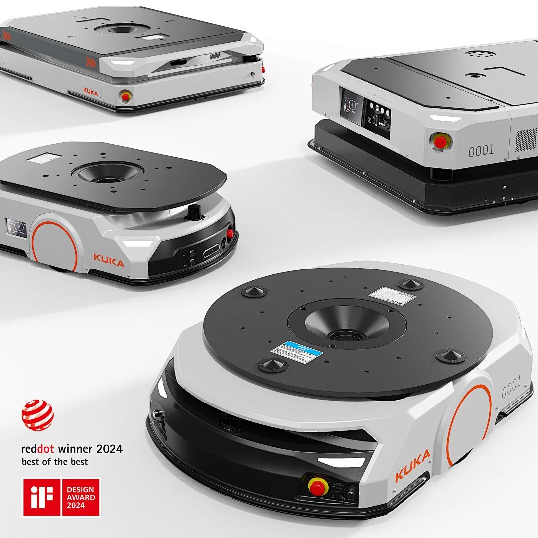 2024年6月24日,红点设计大奖颁奖典礼在德国阿尔托歌剧院隆重举行,库卡狂揽多项红点设计大奖,库卡移动机器人的KMP系列(400i、600PCU、1500P、3000P)传承库卡品牌设计理念,传递安全、可靠以及工业美学的视觉盛宴,将工业美学与功能主义在AMR中完美融合,一举夺得享有“设计界奥斯卡”的Red Dot Winner 2024 – best of the best(德国红点至尊奖)与iF Design Award 2024(德国iF设计奖)两项国际权威设计大奖。