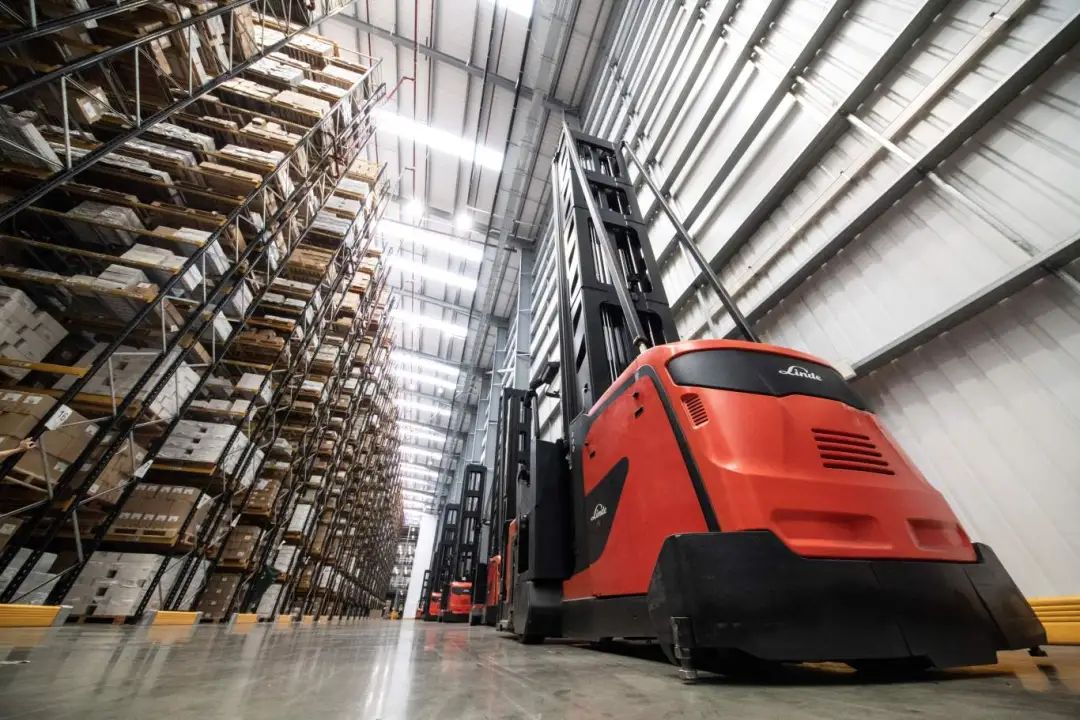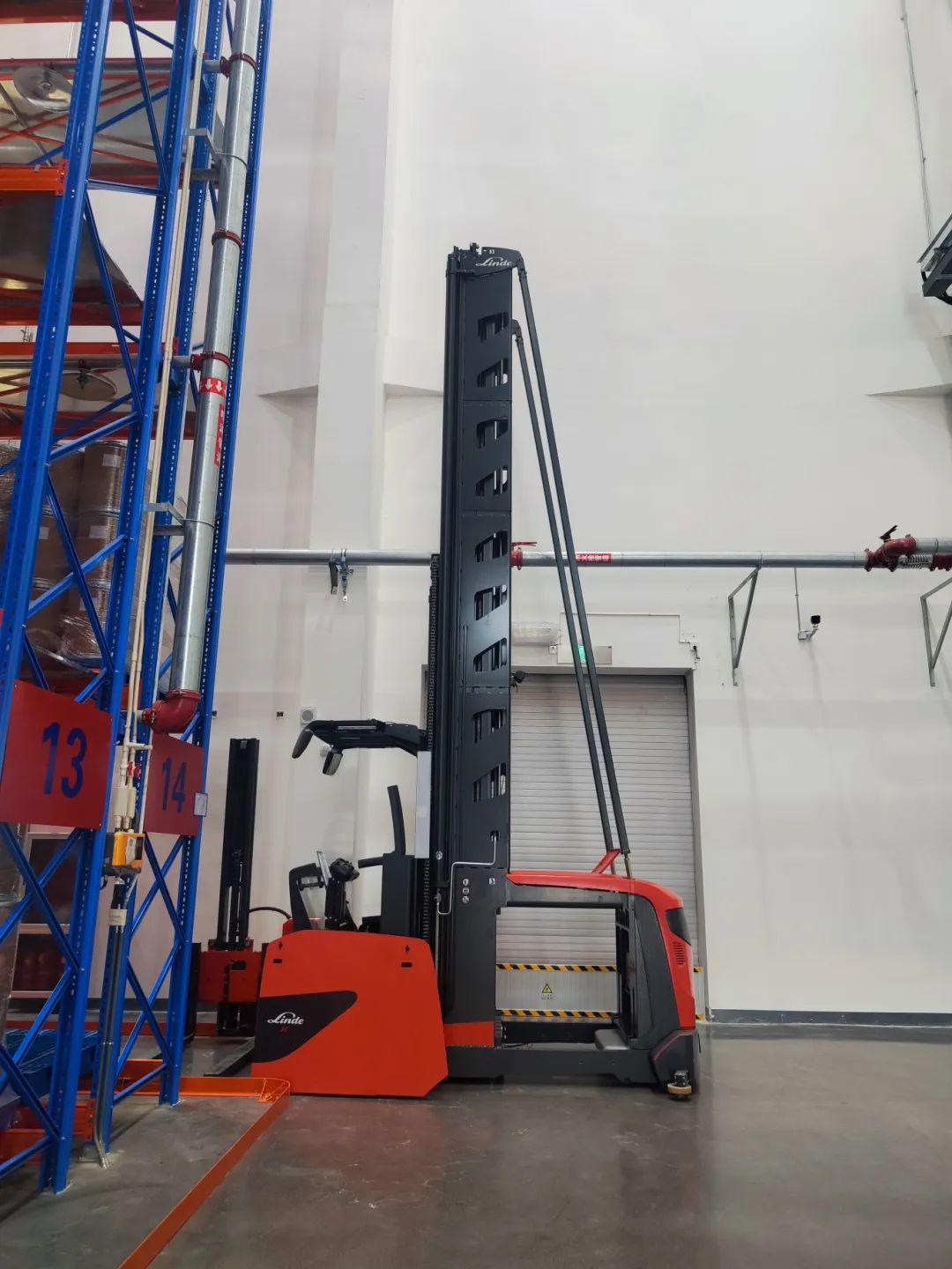 针对货物种类众多,托盘尺寸偏大,提升高度要求需达到 17.5 米,林德叉车根据现场的实际工况和使用需求,打造了合适的窄通道货架方案,并结合林德窄通道三向堆垛叉车,实现了高货架高密度的存储。