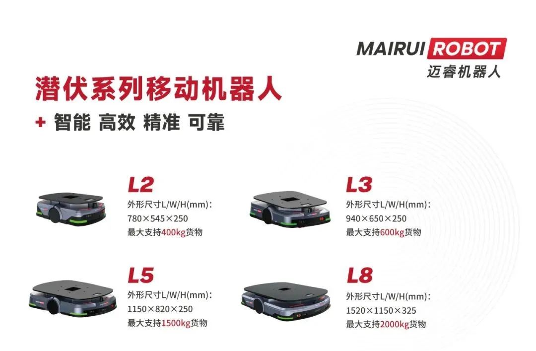 迈睿机器人一直致力于AMR技术的研发和应用,拥有丰富的技术积累和实践经验。目前迈睿机器人面向市场的第四代AMR产品,L2、L3、L5以及L8产品支持多种导航方式(激光SLAM、纹理导航、二维码导航等)的灵活选择,支持负载400KG-2000KG,满足几乎所有工业场景的需求。同时,支持前后270°避障、3D避障、示宽灯、智能语音交互等功能,运行速度可达2.0m/s,差速驱动和灵活的转向能力使之能迅速地应对各种复杂环境,可自主充电保证能够实现7*24小时的不间断作业,从而大幅提高工作效率。目前,迈睿潜伏式系列机器人已广泛应用于汽车,新能源,制造,3C电子、设备制造、医药、纺织、生物科技等行业。