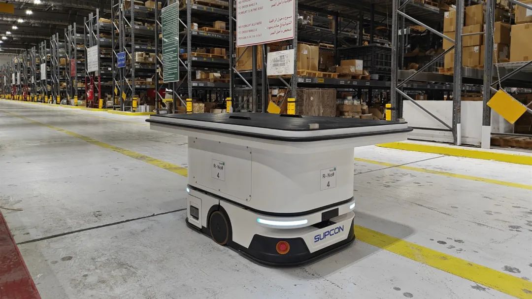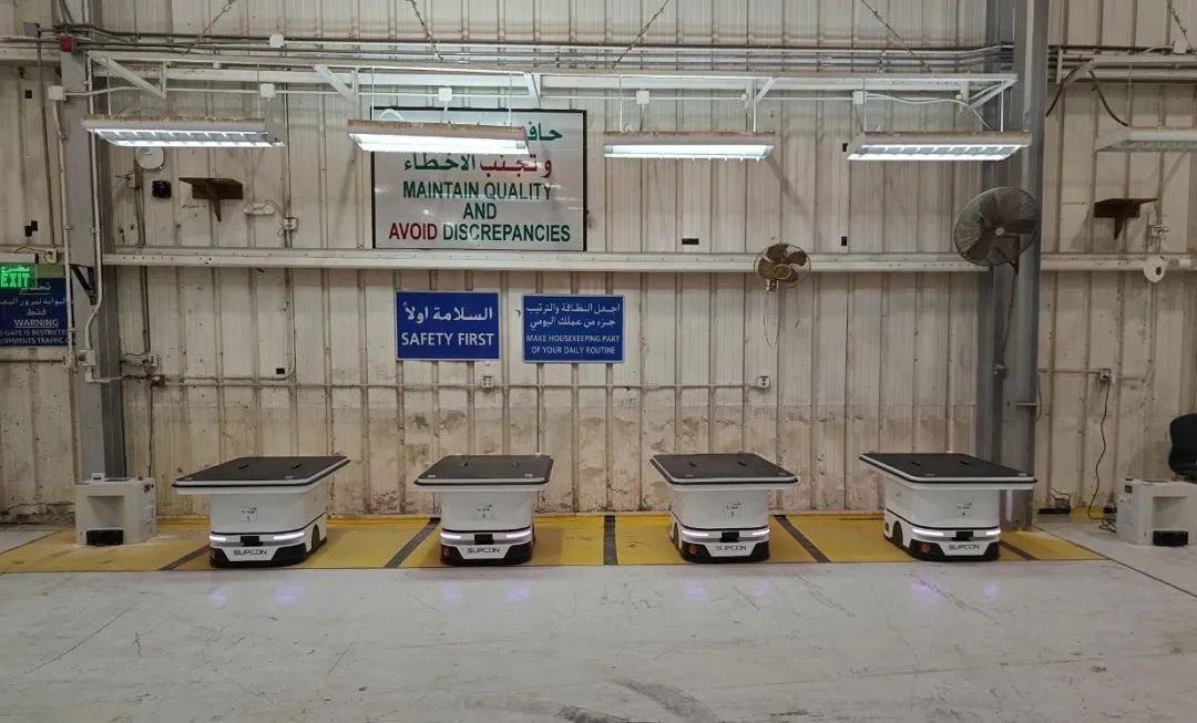 若干台迦智科技室内工业级自主导航搬运机器人EMMA600K,目前部署于沙特阿美公司总部的车间仓库。