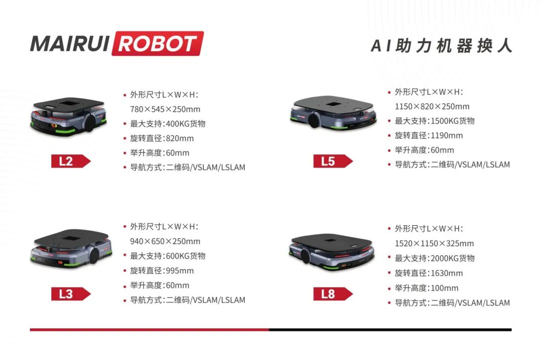 目前迈睿机器人面向市场的第四代AMR产品,L2、L3、L5以及L8产品支持多种导航方式(激光SLAM、纹理导航、二维码导航等)的灵活选择,支持负载400KG-2000KG,满足几乎所有工业场景的需求。迈睿产品具有精密生产工艺、稳定可靠的机械结构及严格的质量管理体系,能满足客户对高品质、高可靠性和高安全性的要求。