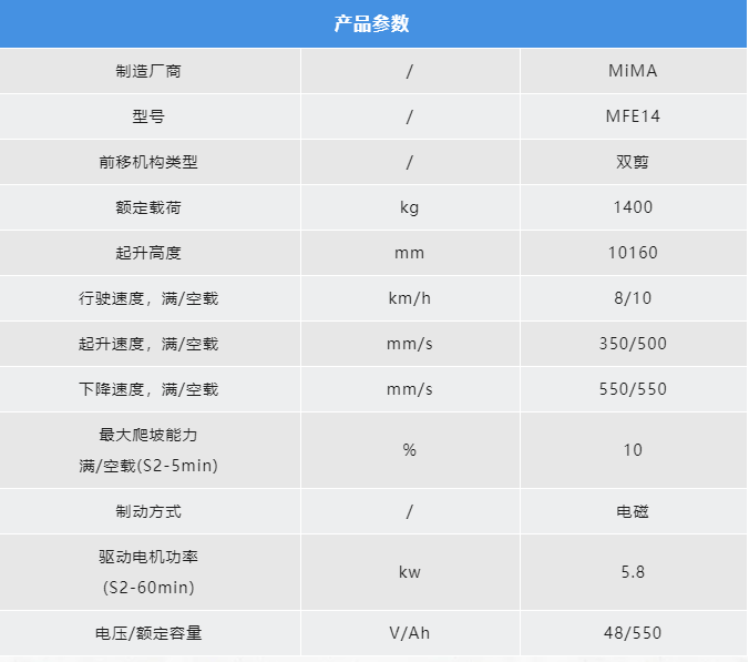 MiMA米玛MFE双剪刀叉前移式叉车,配备剪叉伸缩机构,可实现剪叉灵活伸缩、侧移及倾斜调整,构建高效取放货方案,满足多样化仓储需求。