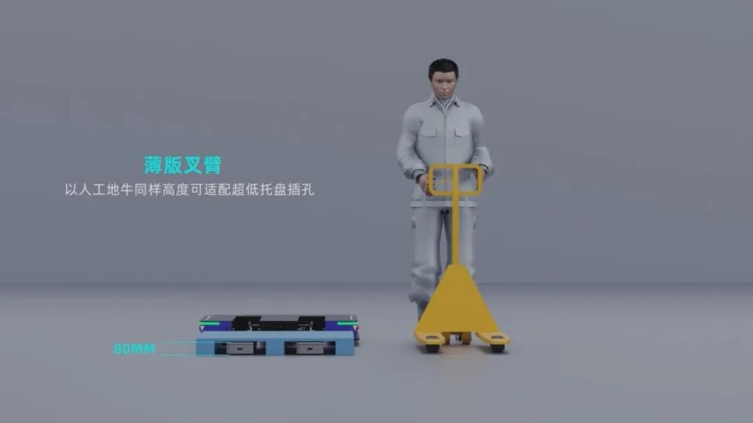突破机械结构的极限,APR叉臂的厚度做到80mm,叉臂的厚度与叉车货叉的厚度近似,以人工地牛同样高度可适配超低托盘插孔,托盘的适应性更强。