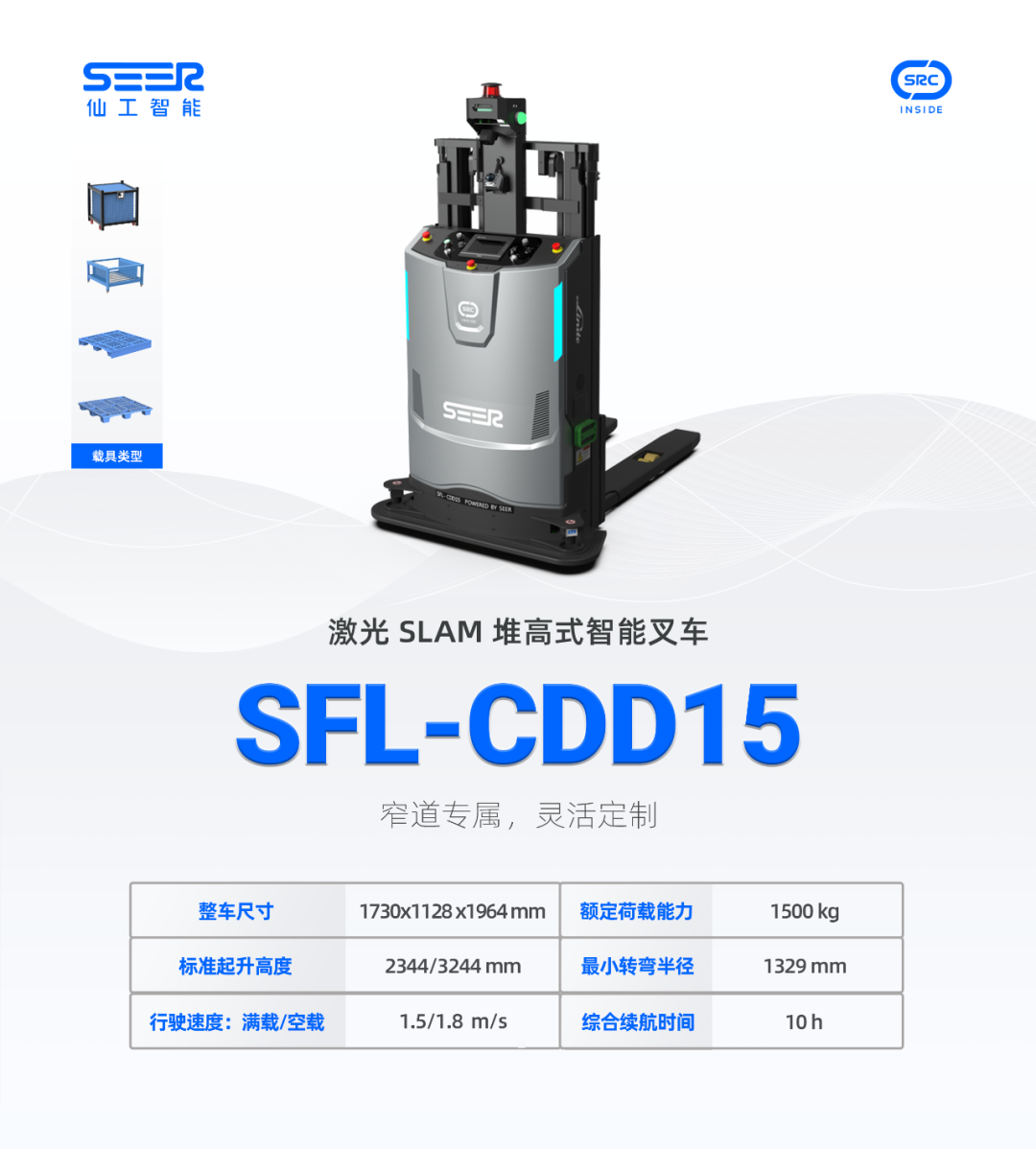 SFL-CDD15 基于林德车体打造,内置仙工智能 SRC 控制器,产品竞争力 Next Level。
