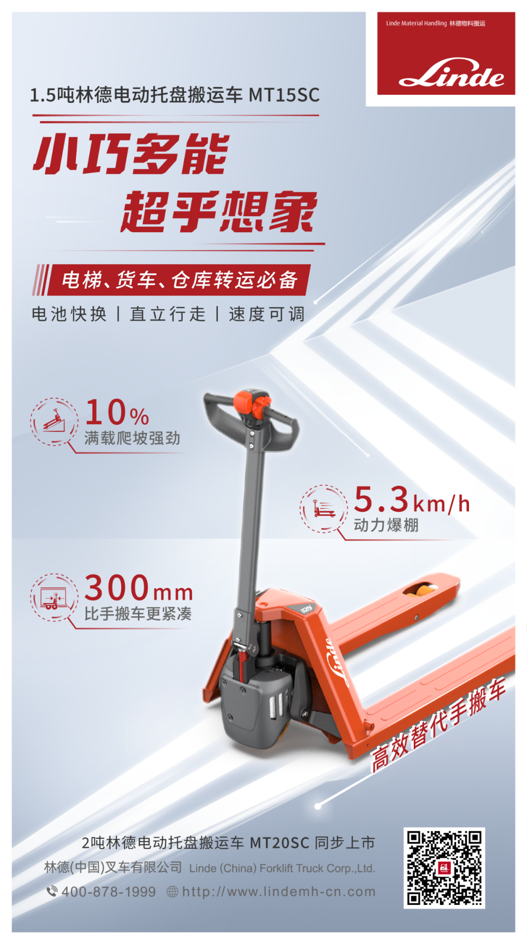 为进一步解决轻工况搬运的诸多痛点,林德物料搬运沿袭百年智慧,打造全能战神-1.5-2吨林德电动托盘搬运车MT15SC/MT20SC,以六大价值同步发力,以全景适配运行姿态,为行业客户释放轻工况搬运效能。