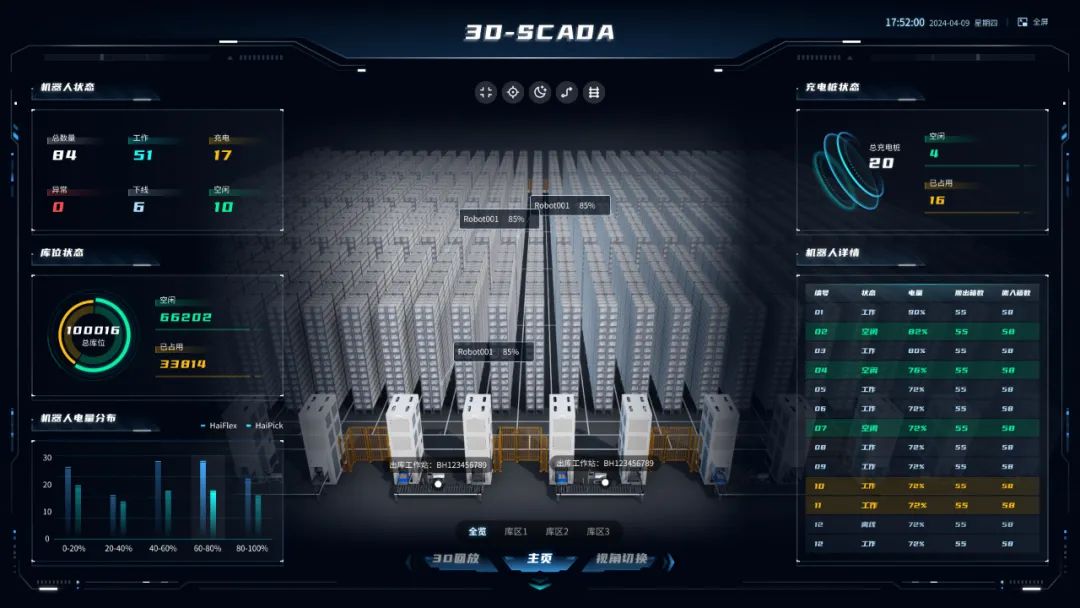 数字孪生平台可实时、精确映射现实里的仓库环境,包括机器人的行驶路径、运行状态、机器人电量、库位热度、料箱热度等。