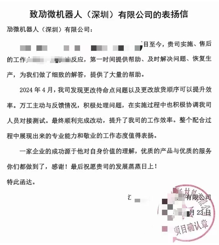 下图是位于中国江苏盐城新材料制造隐形冠军企业,导入了劢微平衡重式无人叉车,实现了产线物流自动化和信息化升级,提高了效率,降低人为安全操作隐患。在整个交付过程中,客户对产品的创新性和稳定性高度认可,现场交付人员以专业能力和工作态度,获得了客户的高度表扬,客户在表扬信中提到“一家企业的成功源于他对自身价值的理解,优质的产品与优质的服务你们都做到了,感谢!最后祝愿贵司的发展蒸蒸日上!”