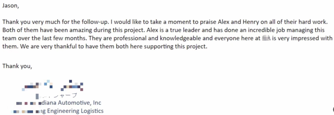 下图为收到北美某世界500强汽车整机制造企业表扬信,该企业通过导入了劢微7台平衡重式无人叉车,2台微蜂X20,及仓库管理系统WMS,调度系统RCS,实现了工厂智能物流自动化和信息化升级,目前该客户已进行了多次复购。在整个交付过程,客户对交付现场人员的专业表现,产品技术的运行效率和稳定性频频点赞,信中主要提到Members of Multiway are professional, knowledgeable and hard-working, show leadership, and excel at team managment.