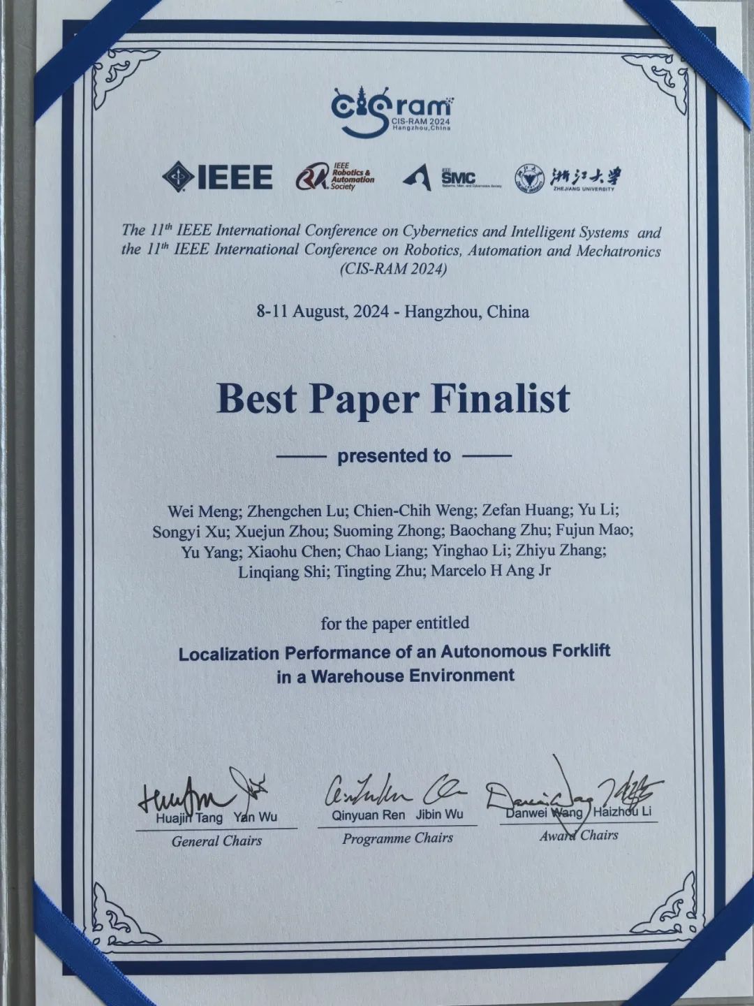 在这次大会中,上海诺力智能科技有限公司的导航调度工程师孟威代表研发团队,分享了以《仓库环境中自动叉车的定位性能》为研究课题的论文,并获得了本次会议最佳论文奖的提名。该研发团队的成员来自诺力智能装备股份有限公司、诺力智能物流装备研究院和上海诺力智能科技有限公司。2023年起,诺力先后引进多名国际机器人专家,开展物流移动机器人无人驾驶关键技术研发,该篇论文的研究成果,正是诺力持续不断在智慧物流科技领域研发投入结出的丰硕成果。