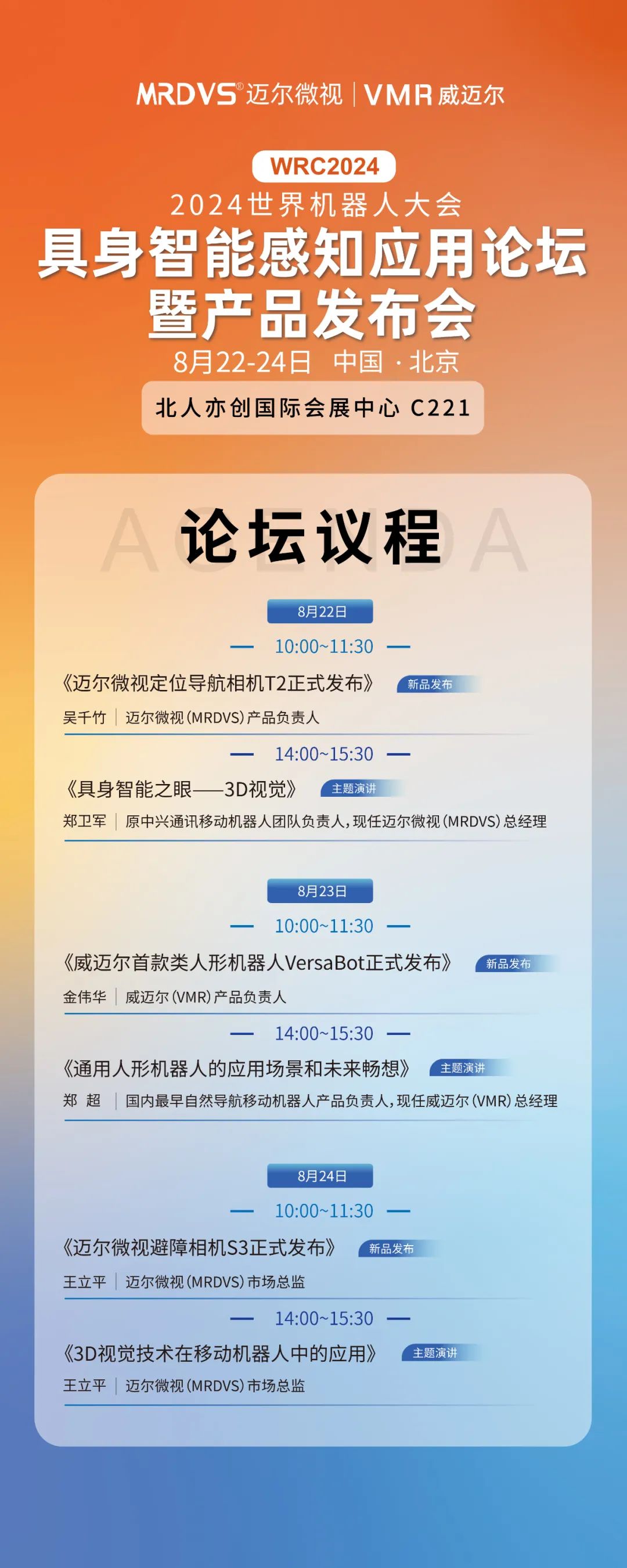 8月21日,全球科技界翘首以盼的世界机器人大会即将于下周在首都北京拉开帷幕。迈尔微视(MRDVS)将同期举办“具身智能感知应用论坛暨产品发布会”,正式发布机器人导航相机T2和避障相机S3。