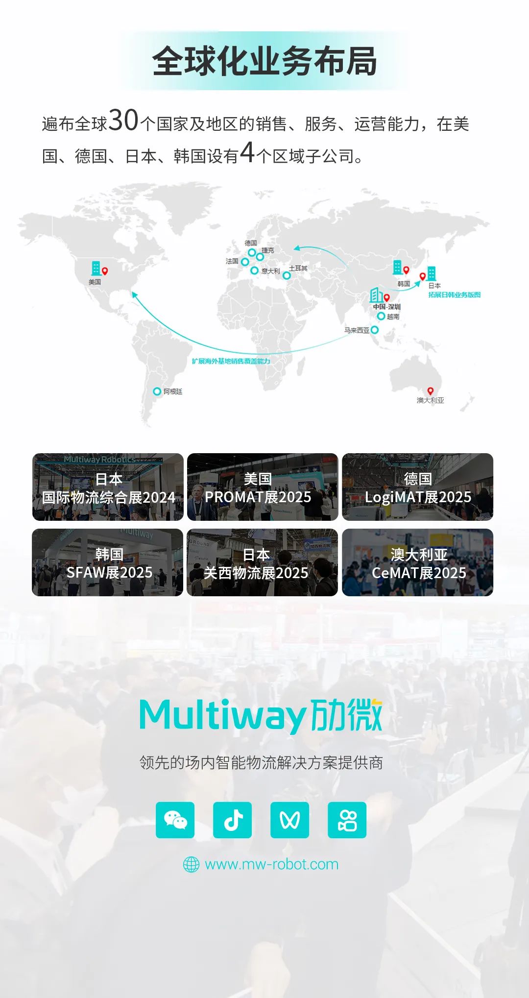 劢微机器人(Multiway Robotics)是一家领先的场内智能物流解决方案提供商。总部位于中国深圳,在华中、华东、西南、东北等地均设有办事处,并且成立了海外运营中心,业务销售、运营和服务覆盖国内外各地区。