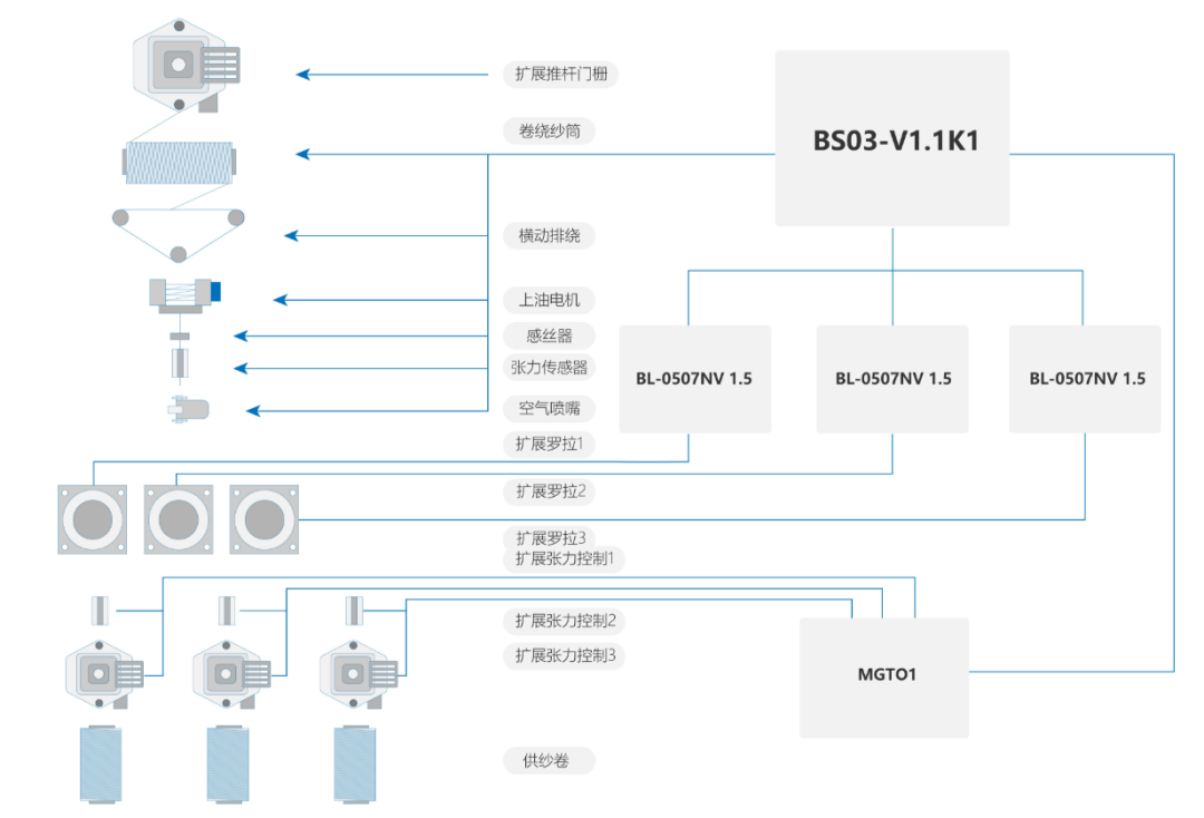 北京和利时电机技术有限公司基于电子导纱技术领域深耕20年的经验,开发出了一系列的电子导纱并纱机控制系统。