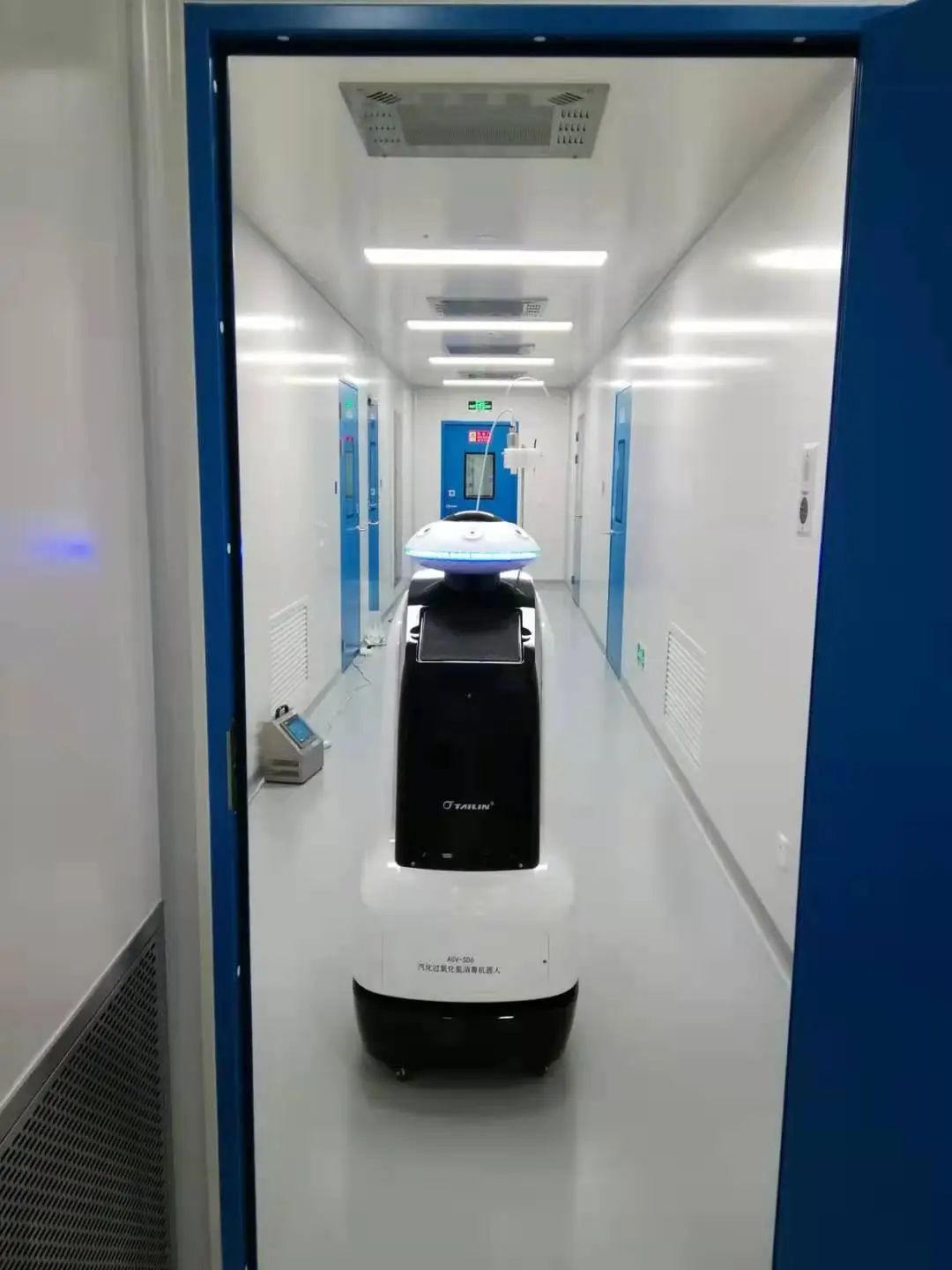 过氧化氢消毒因其高效、安全、环保等特性已广泛应用于医院、疾控中心、制药车间、实验室等多种场景的空间消毒。传统的消毒方式需要人工定点转移放置消毒设备,但由于场景分布复杂以及人工操作的不稳定性,难以保证消毒的全面性和有效性。泰林通过结合机器人激光导航系统和VHPS®干法灭菌这两项技术,打造了具有划时代特征的AGV-SD6过氧化氢消毒机器人,真正实现消毒的智能化和安全化,保障消毒效果。