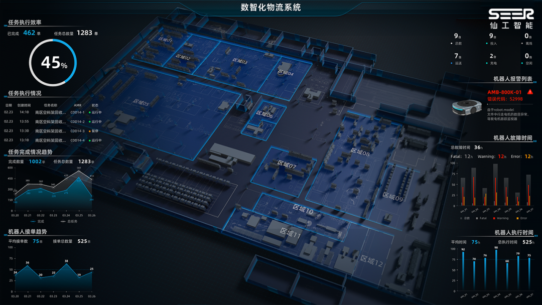 针对客户这一主要诉求,仙工智能基于可视化系列产品 3D 机器人可视化地图 Meta-Map Pro 提供了一套定制化的跨区域作业可视化大屏解决方案。
