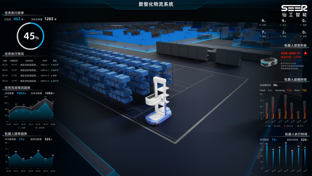 近期,华东地区某工业自动化头部企业通过落地仙工智能可视化大屏解决方案,实现了对移动机器人运行状态和任务进度的全面监控,并通过强大的可视化辅助业务决策,优化移动机器人作业,显著提升了工厂的管理效率和运营能力。